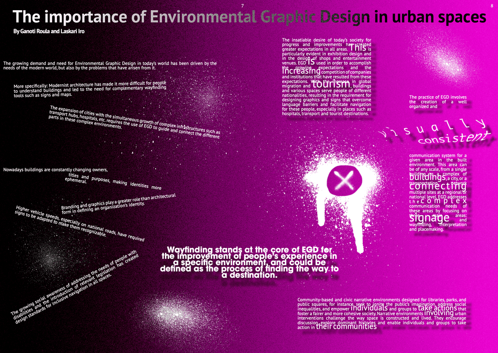 This magazine, designed in Adobe InDesign, explores the intersection of graffiti and wayfinding, focusing on how the original intent and raw expression of graffiti often gets lost in translation when it's absorbed into formal design systems. The concept was inspired by Ellen Lupton’s ideas in Text and the research of Ganoti Roula and Laskari Iro in The Importance of Environmental Graphic Design in Urban Spaces. Through experimental layouts and typographic contrasts, the magazine reflects on how urban visual language is constantly negotiated between authenticity and control.
