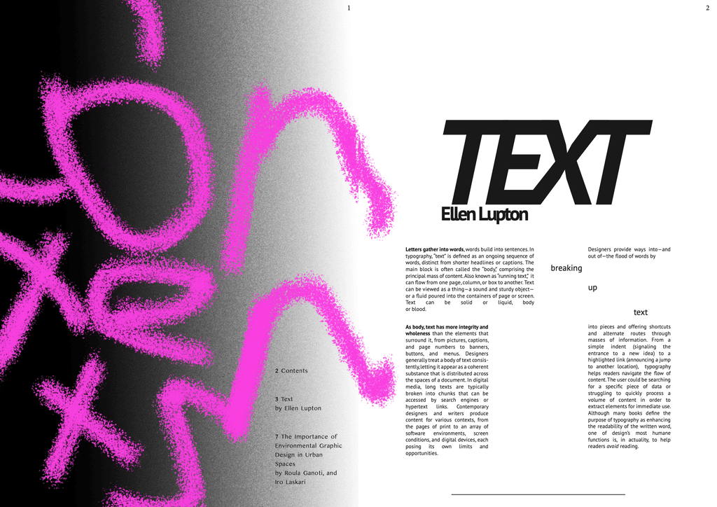 focusing on how the original intent and raw expression of graffiti often gets lost in translation when it's absorbed into formal design systems. The concept was inspired by Ellen Lupton’s ideas in Text and the research of Ganoti Roula and Laskari Iro in The Importance of Environmental Graphic Design in Urban Spaces. Through experimental layouts and typographic contrasts, the magazine reflects on how urban visual language is constantly negotiated between authenticity and control.